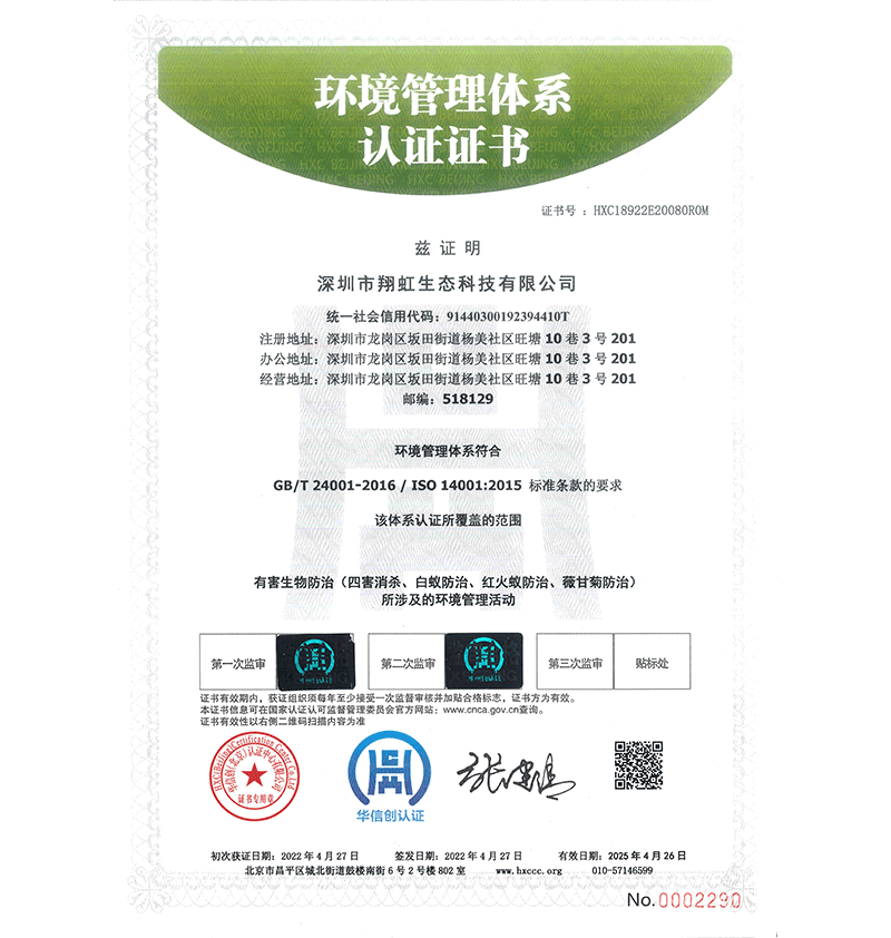 深圳市翔虹生態(tài)科技有限公司成立于1995年,是深圳最早成立的專業(yè)蟲(chóng)害防治公司之一。公司發(fā)展至今獲得全國(guó)有害生物防制服務(wù)A級(jí)資質(zhì)、廣東省有害生物防制服務(wù)A級(jí)資質(zhì)、深圳市有害生物防制服務(wù)A級(jí)資質(zhì)、廣東省有害生物防制服務(wù)A級(jí)資質(zhì)、深圳市有害生物防制服務(wù)甲級(jí)資質(zhì)的單位,是中國(guó)有害生物防治協(xié)會(huì)會(huì)員、廣東省有害生物防治協(xié)會(huì)會(huì)員、深圳市有害生物防治協(xié)會(huì)理事單位,多次獲得“深圳市十佳消殺單位”榮譽(yù)。
